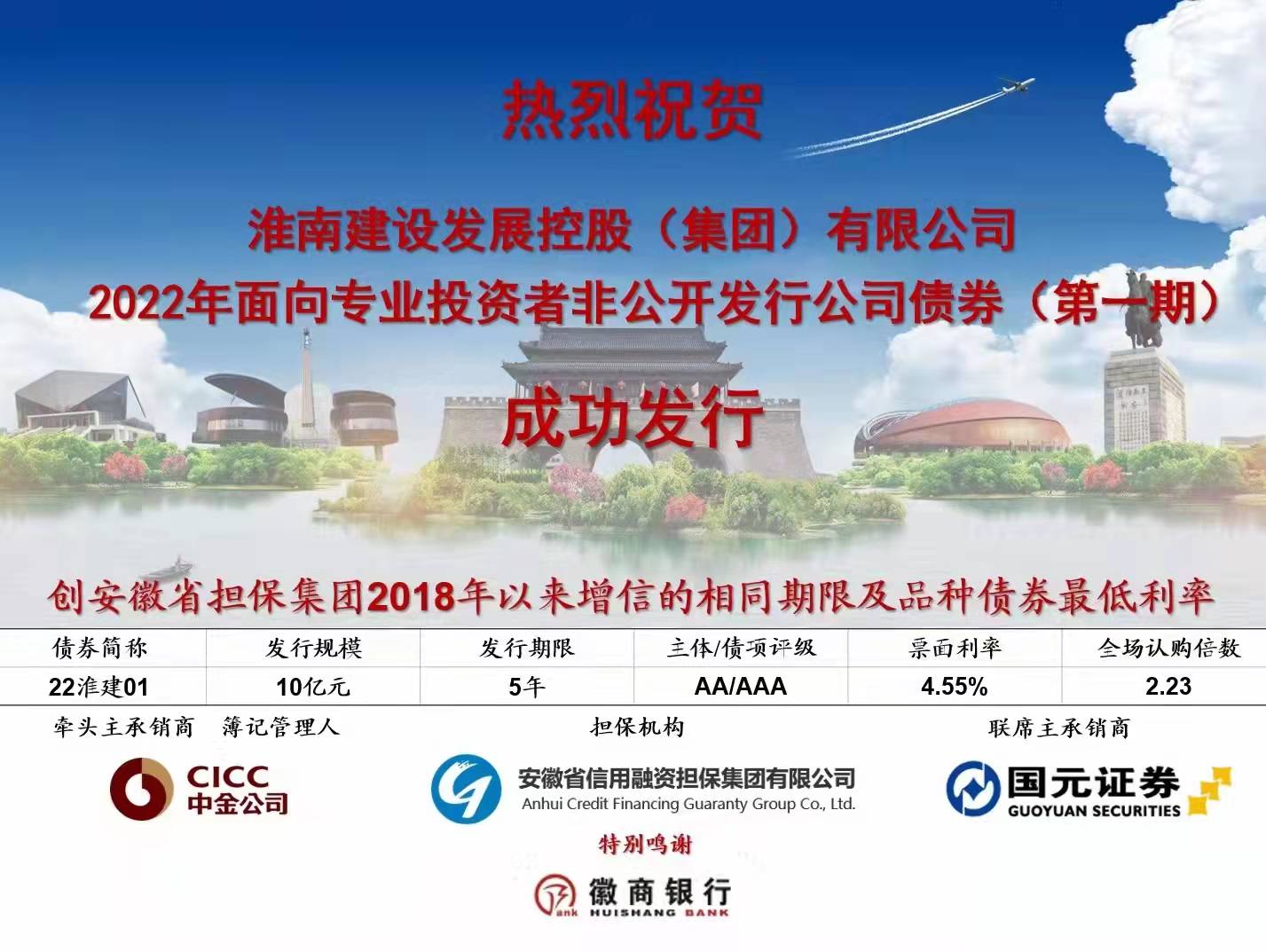 1月12日,建發(fā)集團(tuán)成功簿記發(fā)行公司首單非公開發(fā)行公司債券,債券簡(jiǎn)稱:20淮建01、發(fā)行規(guī)模10億元、票面利率4.55%,安徽省擔(dān)保公司對(duì)債項(xiàng)增信擔(dān)保,認(rèn)購(gòu)倍數(shù)達(dá)2.23倍。