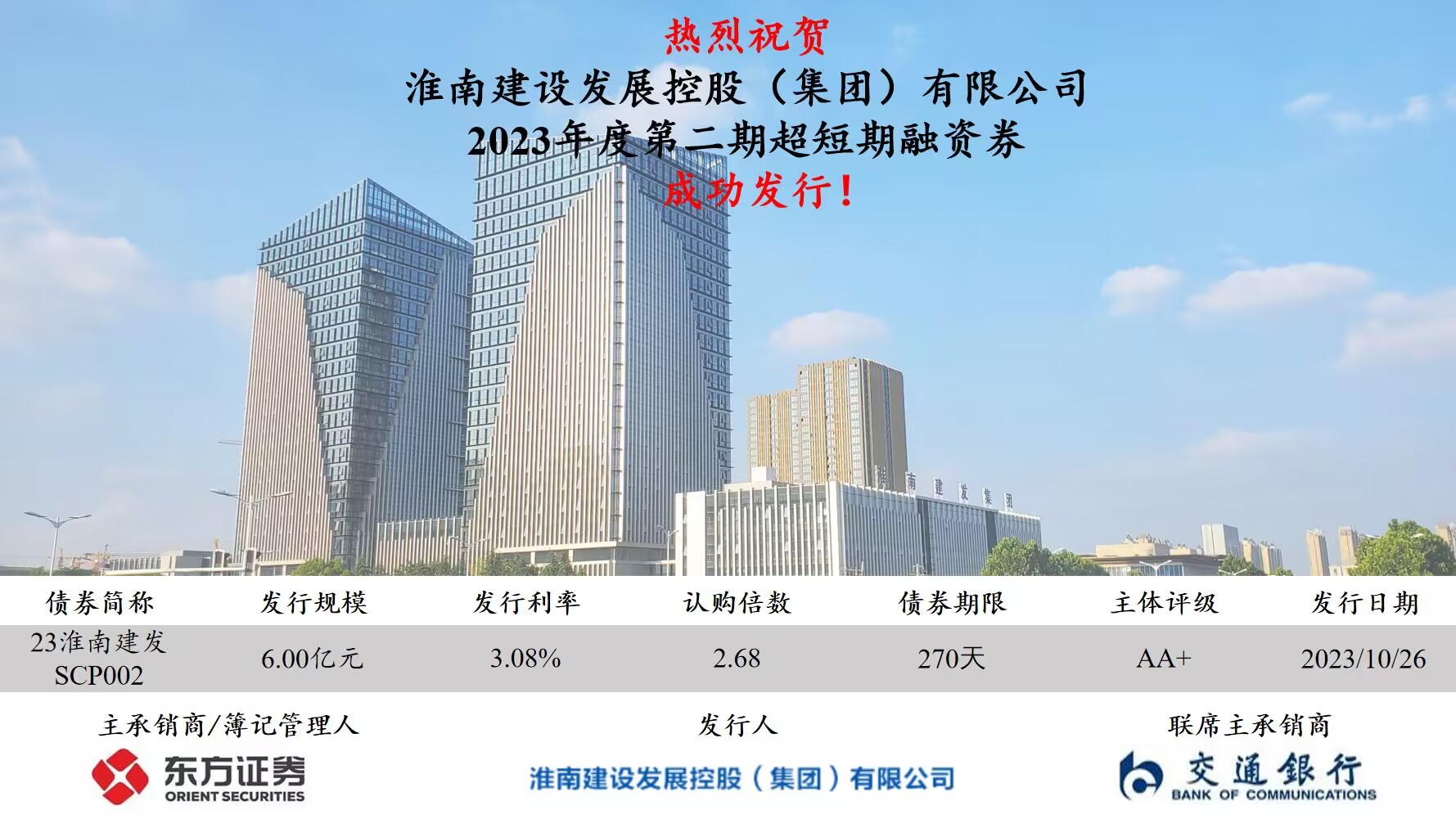10月26日,“淮南建設(shè)發(fā)展控股(集團(tuán))有限公司2023年度第二期超短期融資券”成功簿記發(fā)行,發(fā)行規(guī)模6億元,全場認(rèn)購倍數(shù)2.68倍,票面利率3.08%。較近三月來,同品種、同期限、同評(píng)級(jí)債券平均利率3.25%下降0.17%。